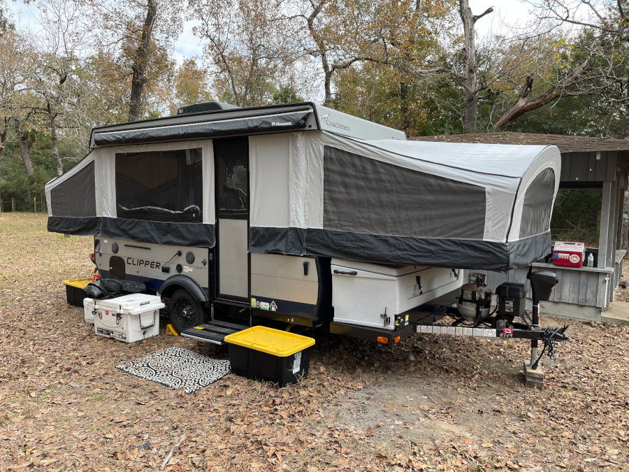 The Coachmen Clipper 1285SST popup camper is feature-packed and packs up to a tiny footprint, given the size of the camper. The camper’s quality lacks a bit given the price, but overall I am pleased. Living in Texas, having the air conditioner and shower for those springtime turkey and hog hunts and the early season big game hunts will come in very handy.